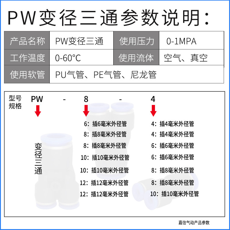Variable diameter tee PW6-4-4 variable diameter tee PW8-4-4 variable diameter tee PW8-6-6 variable diameter tee PW10-6-6 variable diameter tee PW10-8-8 variable diameter tee PW10-8-8