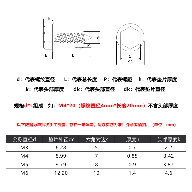304 stainless steel cross external hexagon flange self-tapping screw with cushion self-tapping screw wood screw M3M4M5M6