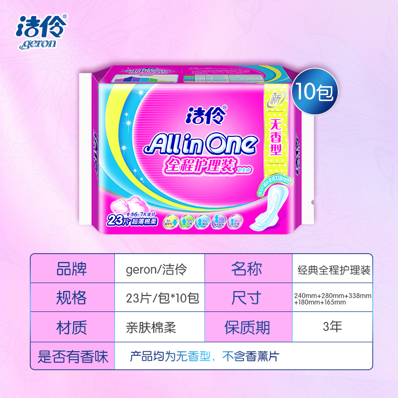 Jieling sanitary napkins full care, soft, super-instant absorption, anti-side leakage, 23 pieces, 10 packs, fragrance-free