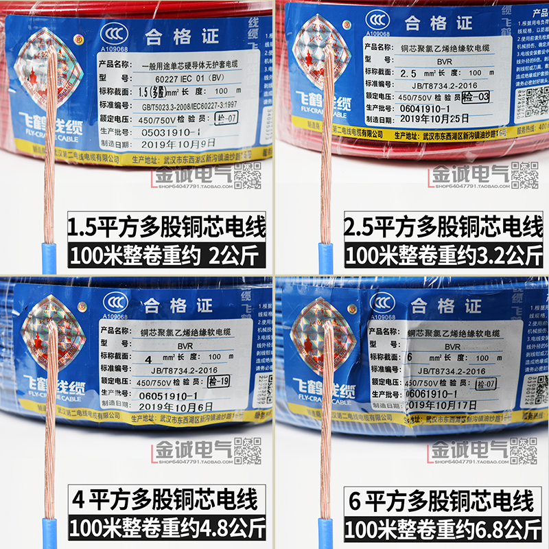 Wuhan II factory flying crane electric wire BVR multi-strand soft core wire 1 5 2 5 4 6 squared red blue Land national standard copper wire