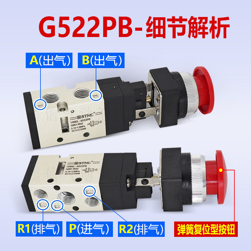 Two-position five-way mechanical valve G522R Two-position five-way large round push button valve G522PB Two-position five-way reset push button valve G522PP Two-position five-way button selection valve G522LB