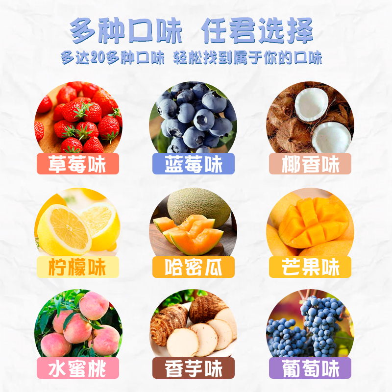 Coconut Fragrance Strawberry Taro (Taro) Mango Blueberry Watermelon Champion Milk Tea (Original Flavor) Peach Yellow Cantaloupe Lemon Rose Green Cantaloupe Banana Grape Orange Green Apple Pineapple (Pineapple) Papaya Vanilla Jasmine