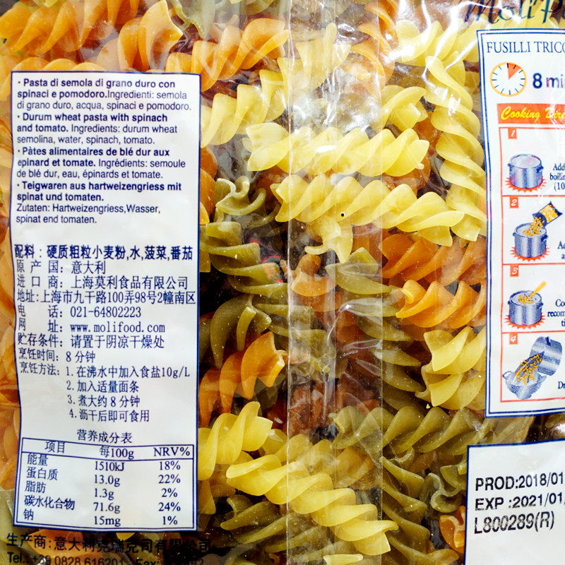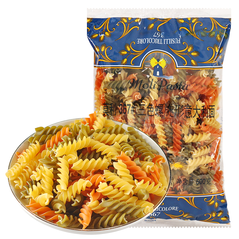 Molly tricolor spire pasta 500g Italian pasta hollow powder Instant Pasta Italian pasta full of 5