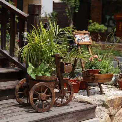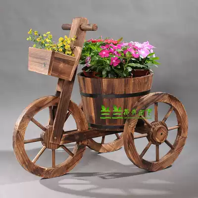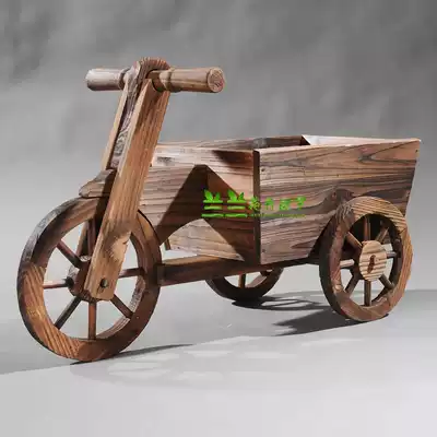 Tricycle flower rack Wooden flower barrel float trolley carbonized anti-corrosion wooden flower pot Wooden barrel photography props fleshy flower device