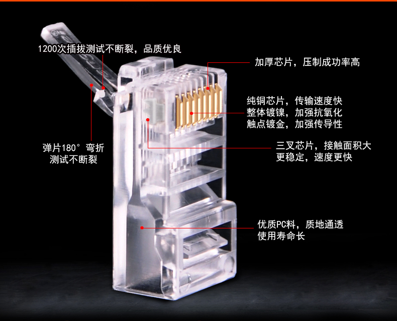 Tengfei pure copper thickened crossing gold super five types 8P network crystal head cat5eRJ45 network line head 8P8C anti-oxidation