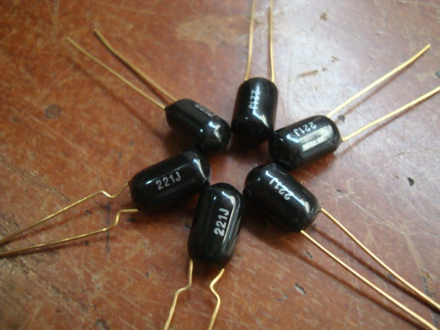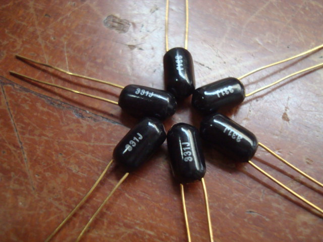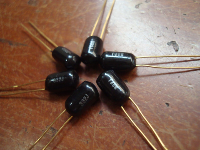 There are 2 Japanese Amtrans 100V 6800PF 4700P black patent leather and gold-plated audio capacitors