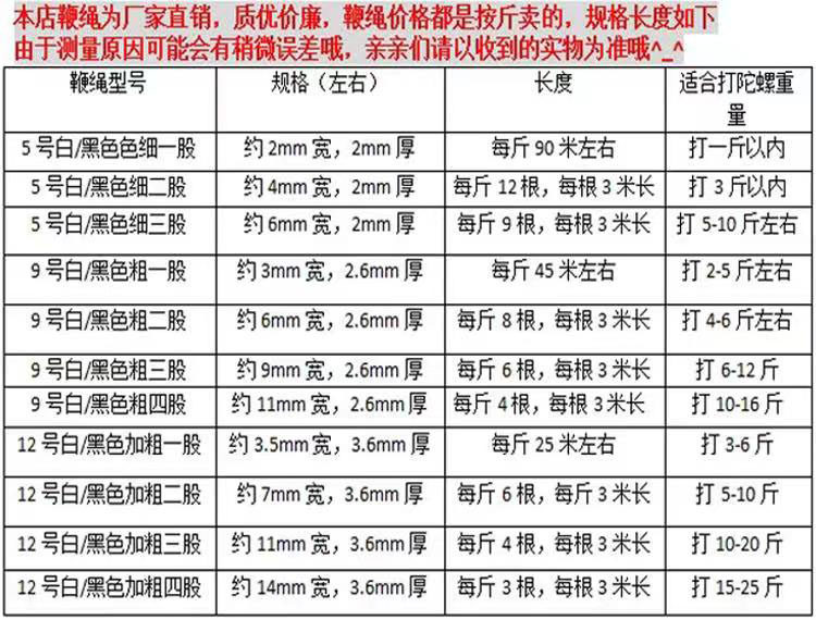 No. 5 white (thin one share) (within 1 pound) No. 5 white (thin two shares) (within 3 pounds) No. 5 white (fine three strands) (playing 5 to 10 pounds) No. 9 white (playing 2 to 5 pounds) No. 9 white (thick two shares) (playing 4 to 6 pounds) No. 9 white (thick three shares) (playing 6 to 12 pounds) No. 9 white (thick four shares) (playing 10 to 16 pounds) No. 12 white (thickened one strand) (playing 3 to 6 pounds No. 12 white (thickened two shares) (playing 5 to 10 pounds No. 12 white (thickened three shares) 10 ~ 20 pounds No. 12 white (thick four shares) play 15 ~ 25 pounds No. 5 black (thin one share) (hit less than 1 pound) No. 5 black (fine two strands) (play less than 3 pounds) No. 5 black (fine three shares) (hit 5 ~ 10 pounds) No. 9 black (play 2 ~ 5 pounds) No. 9 black (thick two shares) (hit 4 ~ 6 pounds) No. 9 black (thick three shares) (hit 6 ~ 12 pounds) No. 12 black (play 3 ~ 6 pounds No. 12 black (thickened two shares) (hit 5 ~ 10 pounds 12 black (thickened three shares) Hit 10 ~ 20 pounds No. 12 black (bold four strands) Hit 15 ~ 25 pounds No. 9 black (thick four strands) (hit 10 ~ 16 pounds) Xinjiang, Tibet, no,Thin one strand, thin two strands, thick one strand, thick two strands, thick three strands