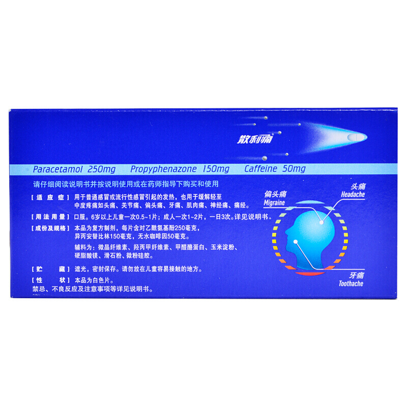 Migraine Arthralgia Fever Headache Menstrual pain and sleep aid Influenza Toothache Dysmenorrhea Neuralgia Muscle pain Stomach cramps Stomach cramps Dysmenorrhea Moderate pain Tonsils