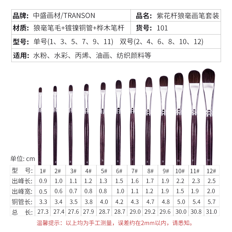 Zhongsheng painting material 101 single and double number purple flower rod round Peak wolf black water color pen gouache pen 6 sets