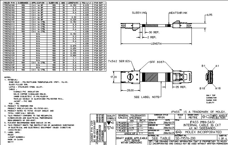 Molex SFF-8087 with SFF-8087 MiniSAS built-in line 36P-36P 1 m 795762104