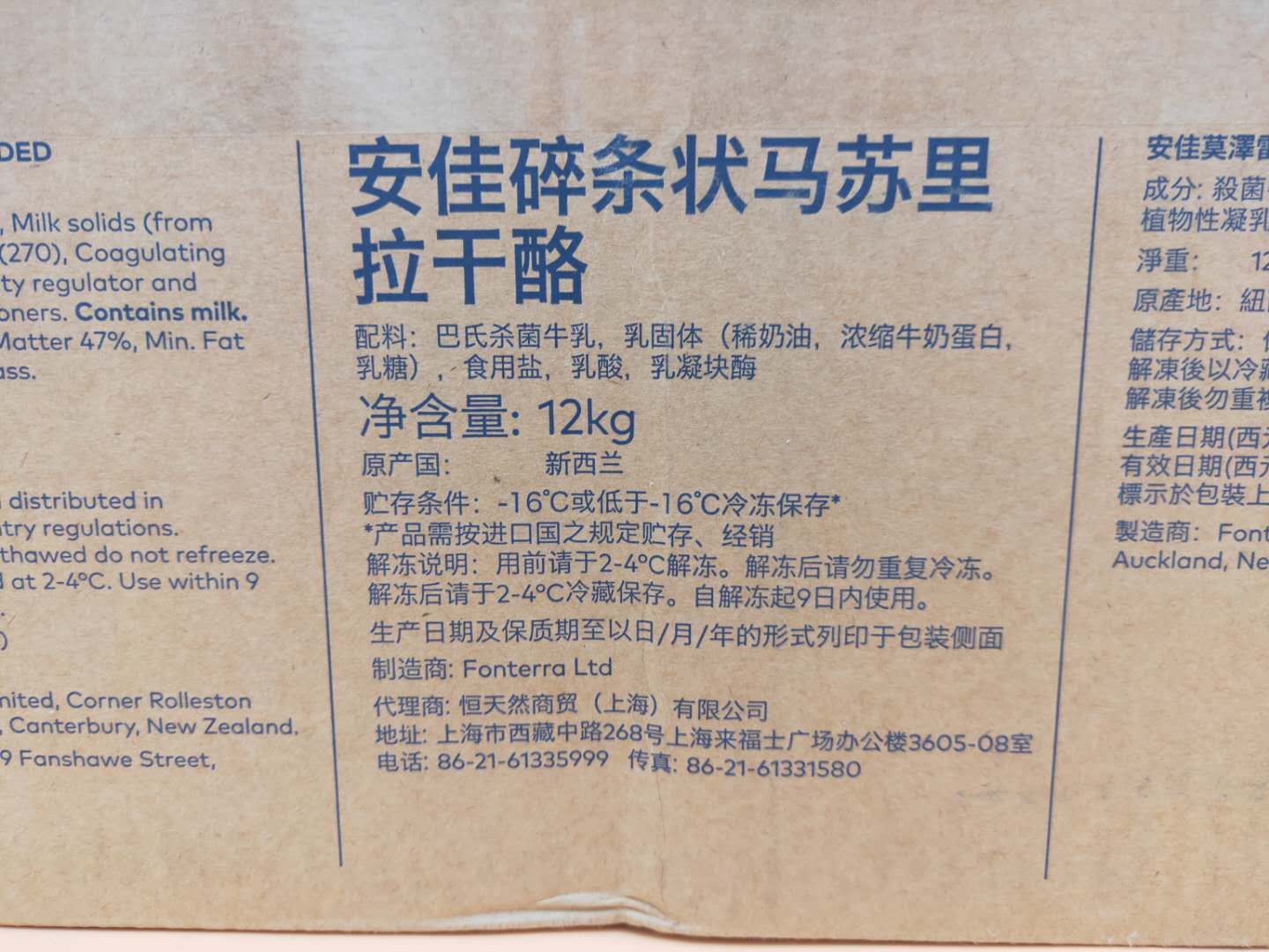 New Zealand Anjia mozzarella shredded 12kg original pizza baked rice shredded cheese push