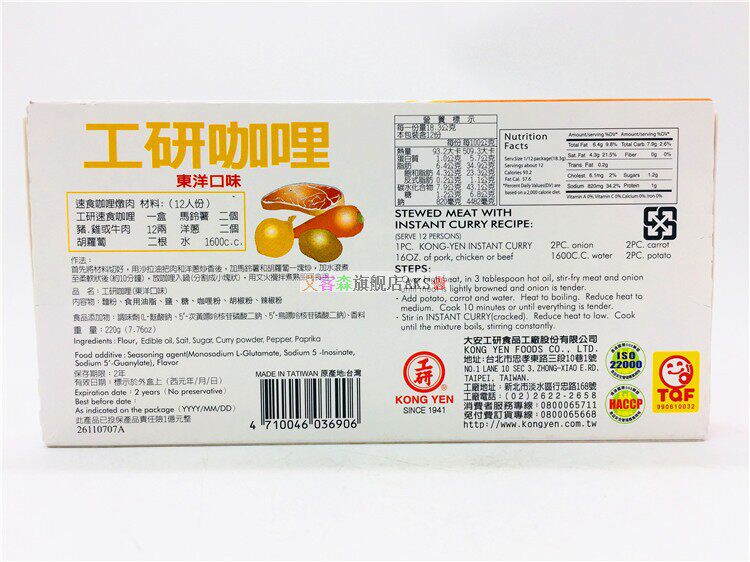 Four boxes imported from Taiwan Gongken Curry (Oriental Flavor) 220g