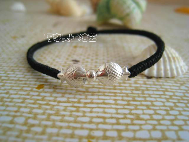 Foot Silver Pure Silver Silver Fish Kiss Fish Double Fish Play Beads Foot Silver Red Rope Bracelet Bracelet for men and women's life