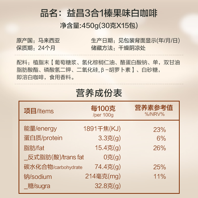 Malaysia imported Yichang Hazelnut flavor reduced sugar Three-in-one instant white coffee powder 15 cups bagged