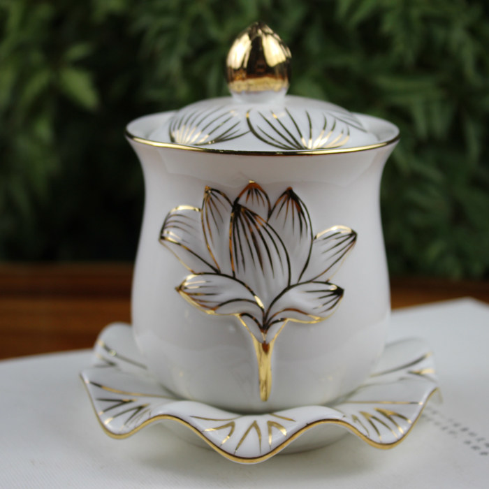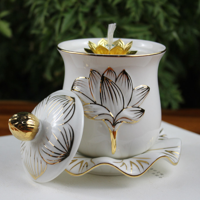 Drawing gold and white jade lotus oil lamp long bright lamp dimming oil lamp liquid butter lamp windproof for Buddha lamp large