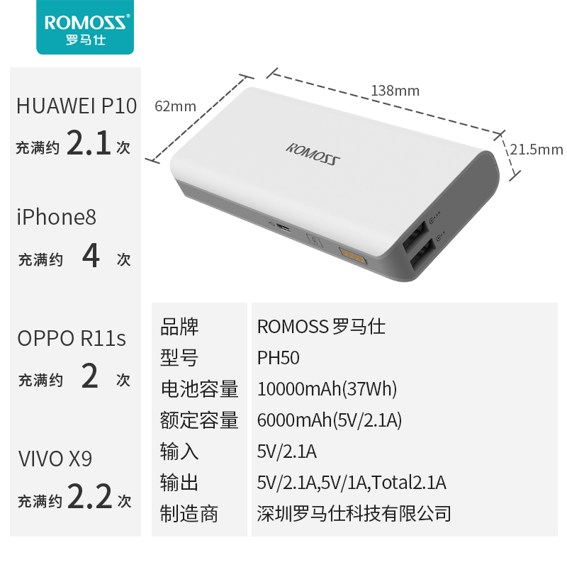 ROMOSS Roman Shi'e 10000 mAh mobile charging portable large capacity action power suitable for Apple Huawei Xiaomi phone
