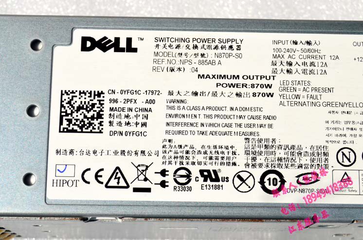 DELL R710 server power supply 870W NPS-885AB YFG1C 7NVX8 12v 71A