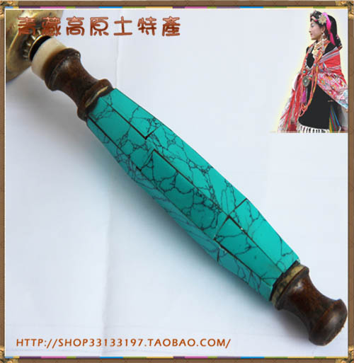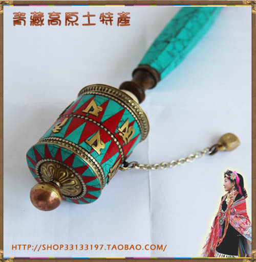 Tibetan Buddhist Buddhist pagan Nepal handmade inlaid green pine stone hand in hand, wheel transfer via cylinder green pine stone handle