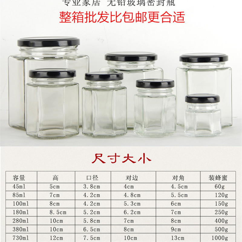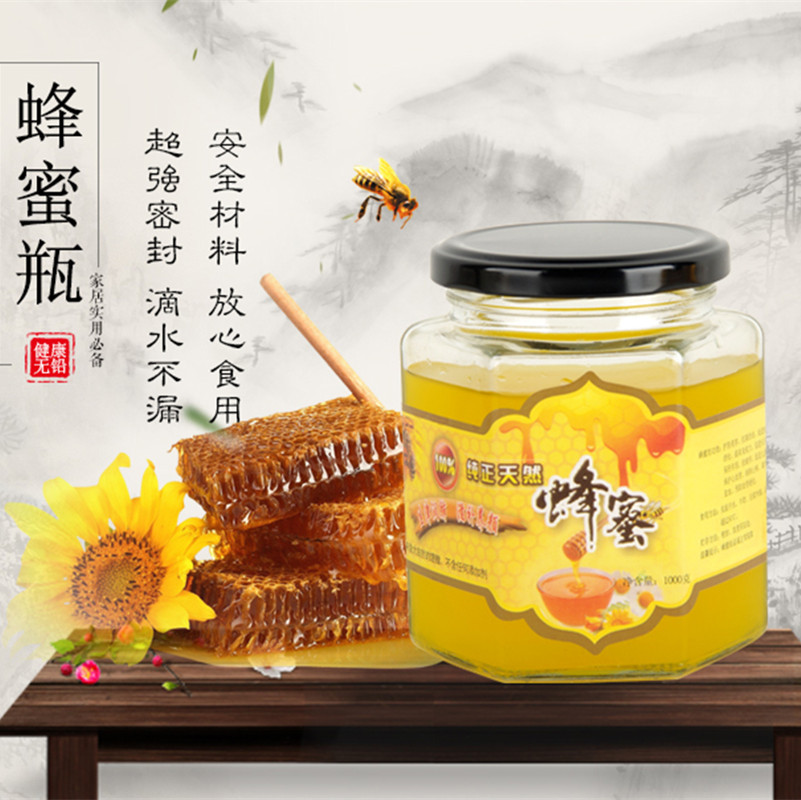 White lead-free glass honey bottle, jam bottle, pickle glass bottle, hexagonal honey bottle, glass bottle