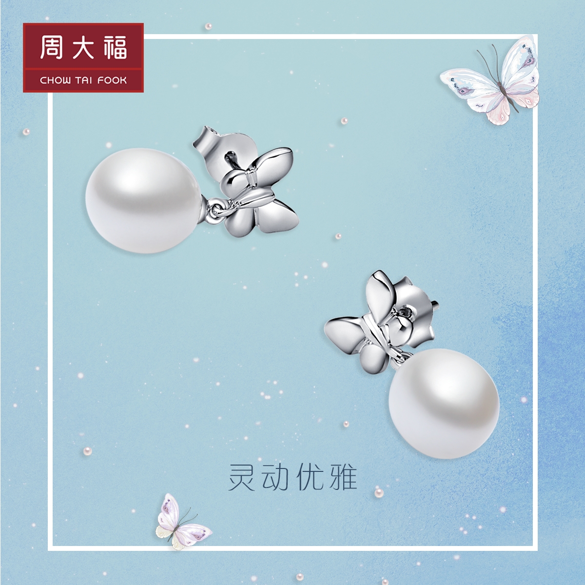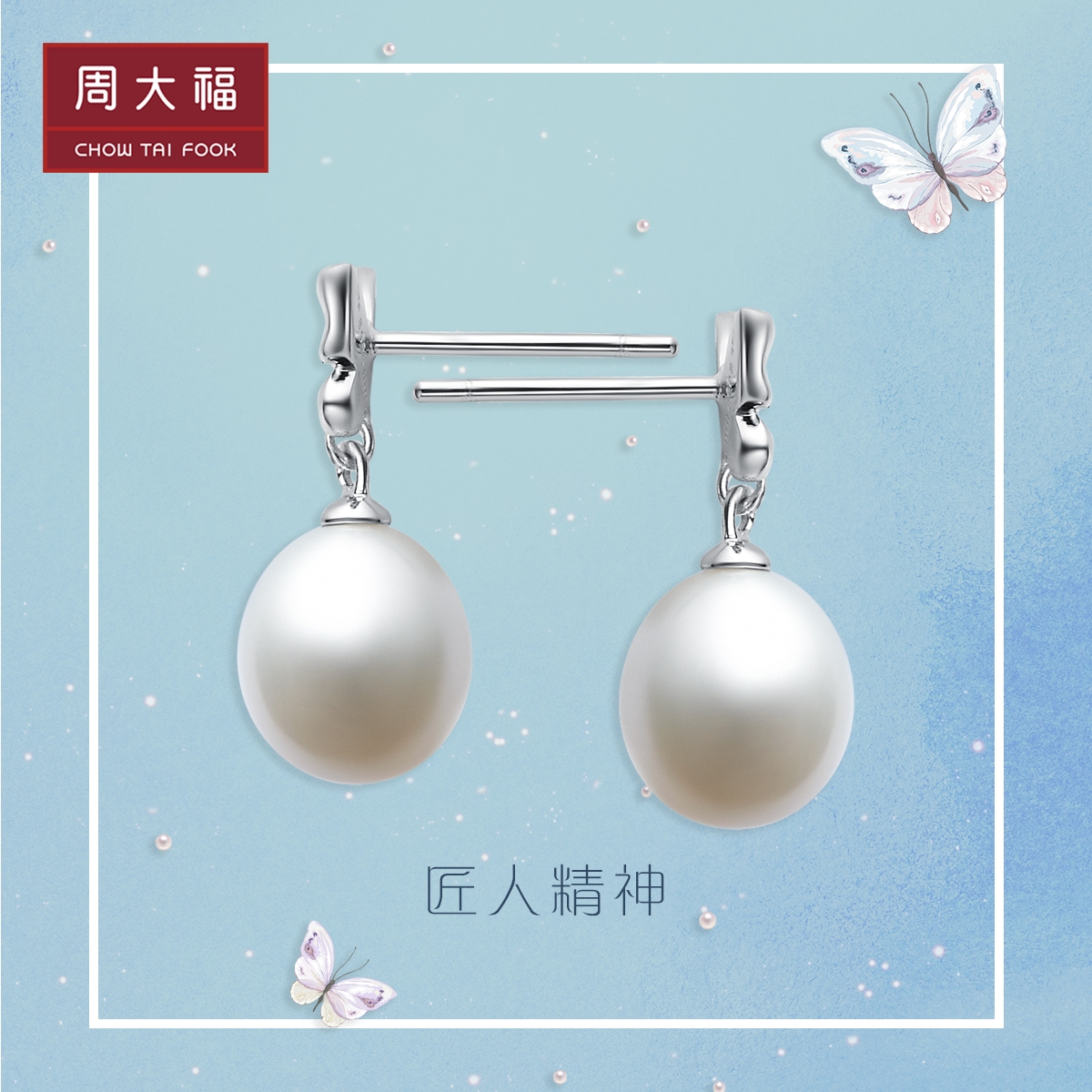 Chow Tai Fook bow 925 silver pearl stud earrings AQ32612 gift selection
