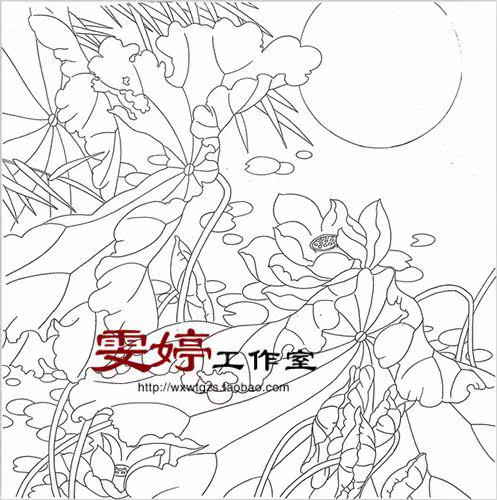 Fine brushwork line drawing real white paper bottom draft flower and bird line drawing Chinese painting draft lotus lotus pond moonlight painting living room painting*