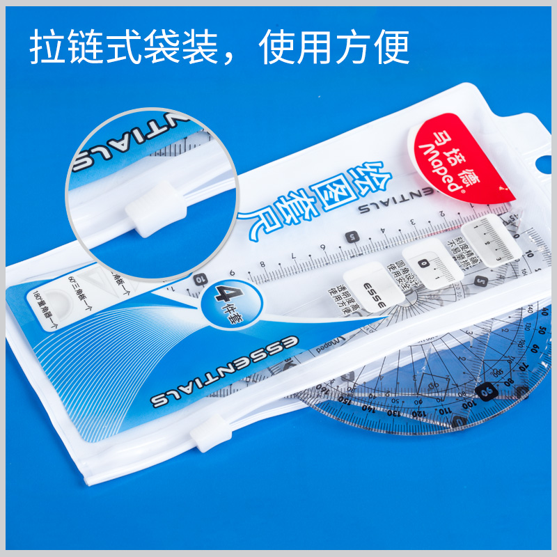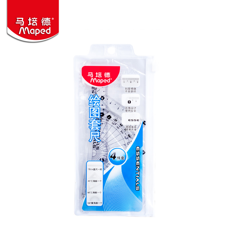 MAPEDMaped drawing sleeve ruler 897123 elementary school children's ruler triangular plate Protractor 4 pieces suit transparent ruler resistant to wear scale clear and versatile portable bagging