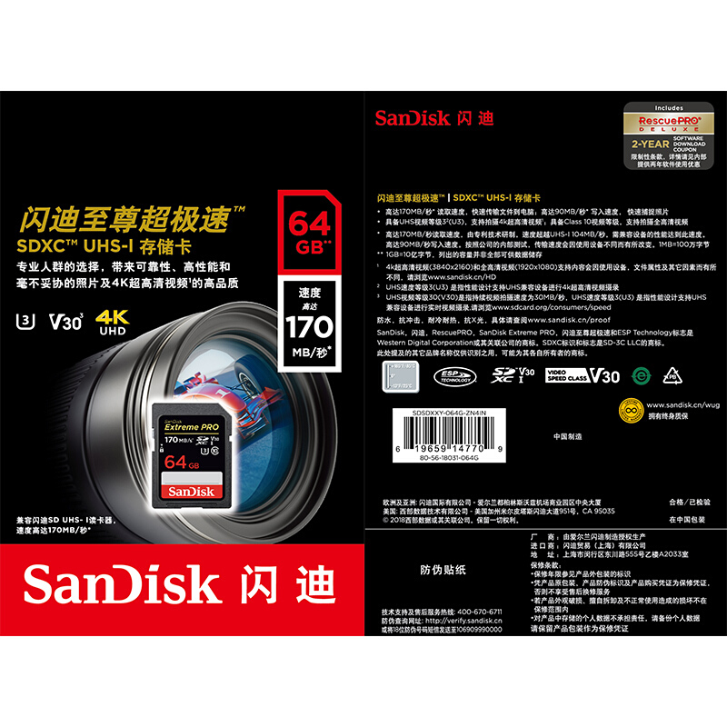 Sandisk SanDisk64G SD memory card U3 C10 4K camera memory card read 170M S write 90M S