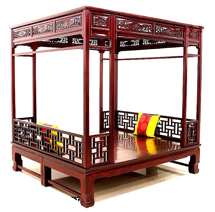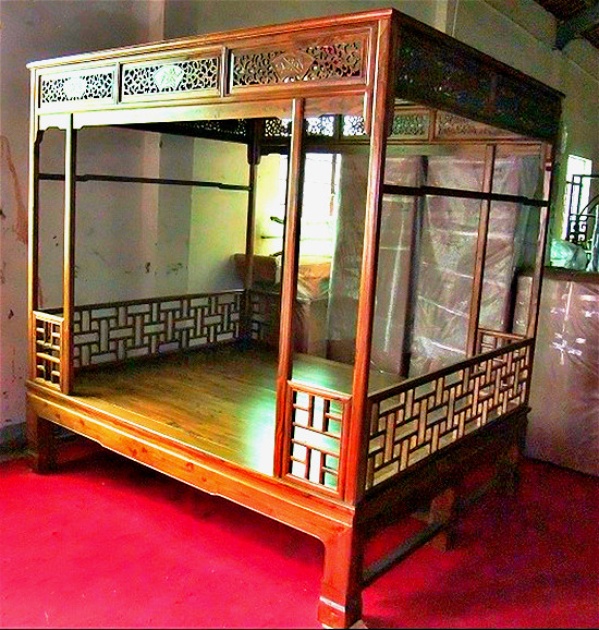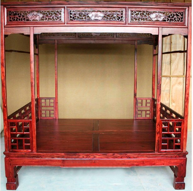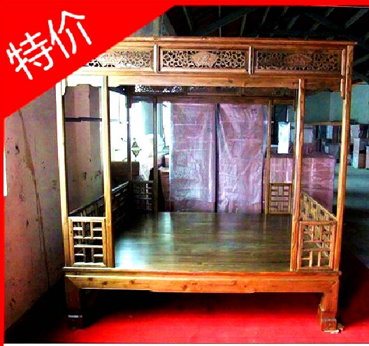 Old elm Chinese imitation classical safflower pear carved double solid wood 10,000-character lattice frame bed Ming and Qing furniture