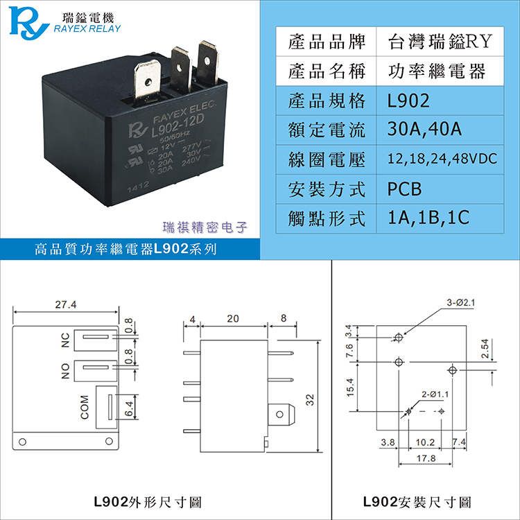 L902-12D24D48D Taiwan Brand RY Rey Electric Motor RAYEX High Power Relay T93