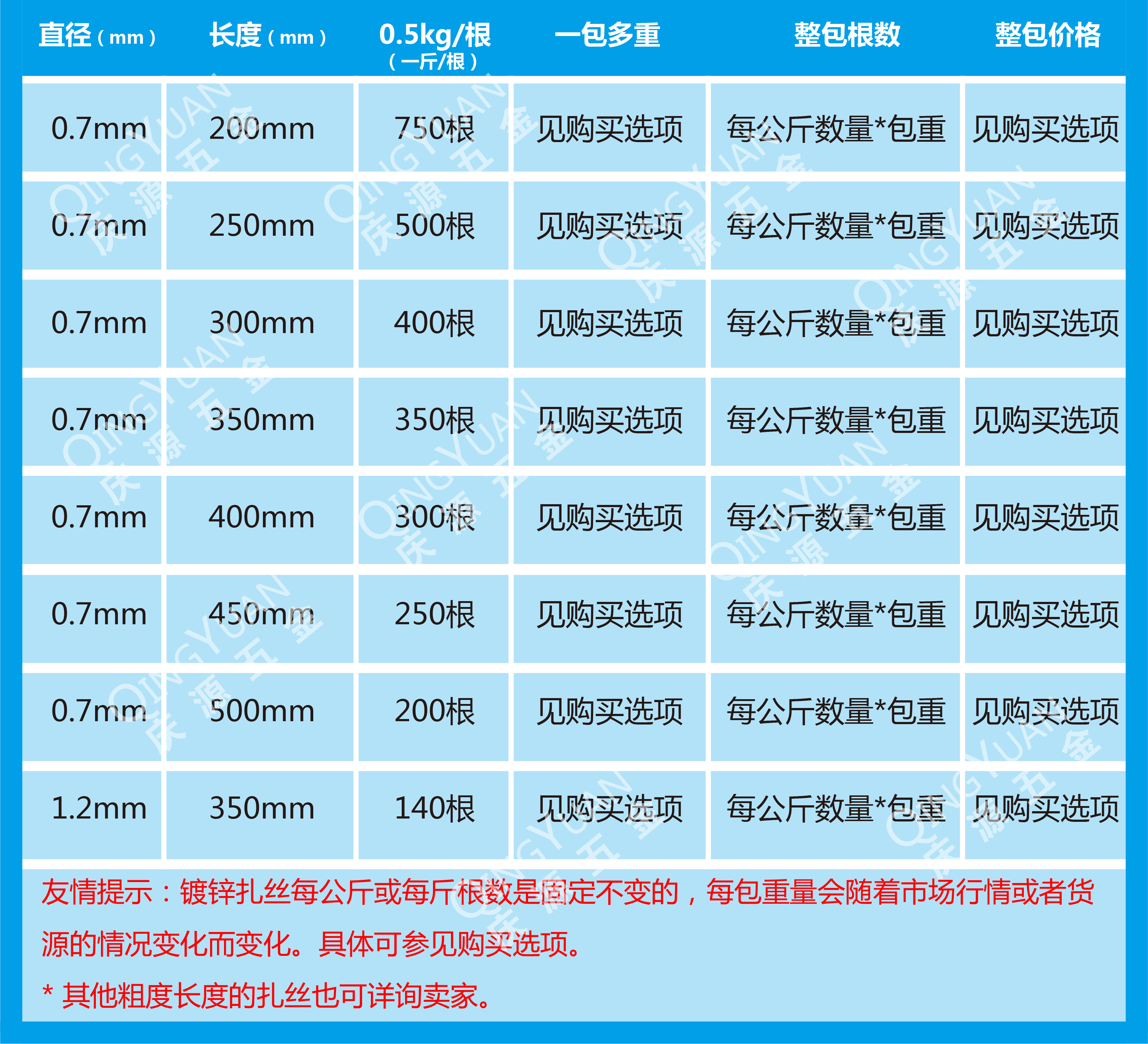 Thick 0.7mm Length 200mm 0.5kg (700 sticks) Thick 0.7mm Long 250mm 0.5kg (450 sticks) Thick 0.7mm Long 300mm 0.5kg (400 sticks) Thick 0.7mm Long 350mm 0.5kg (350 sticks) Thick 0.7mm Long 400mm 0.5kg (300pcs) Thick 0.7mm Long 450mm 0.5kg (250pcs) Thick 0.7mm Long 500mm 0.5kg (200 sticks) Thick 1.2mm long 350mm 0.5kg (140 sticks) Thick 1.6mm long 350mm 0.5kg (80 sticks) Thick 0.7mm long 200mm 2.5kg (3500 sticks) Thick 0.7mm long 250mm 2.5kg (2250 roots) Thick 0.7mm long 300mm 2.5kg (2000pcs) Thick 0.7mm long 350mm 2.5kg (1750pcs) Thick 0.7mm long 400mm 2.5kg (1500 sticks) Thick 0.7mm long 450mm 2.5kg (1250 sticks) Thick 0.7mm long 500mm 2.5kg (1000 sticks) Thick 1.2mm long 350mm 2.5kg (700 roots) Thick 0.7mm long 200mm 5kg (7000 roots) Thick 0.7mm long 250mm 5kg (4500 roots) Thick 0.7mm long 300mm 5kg (4000 roots) Thick 0.7mm long 350mm 5kg (3500 sticks) Thick 0.7mm Long 400mm 5kg (3000 sticks) Thick 0.7mm long 450mm (2500 pieces) Thick 0.7mm long 500mm 5kg (2000 pieces)