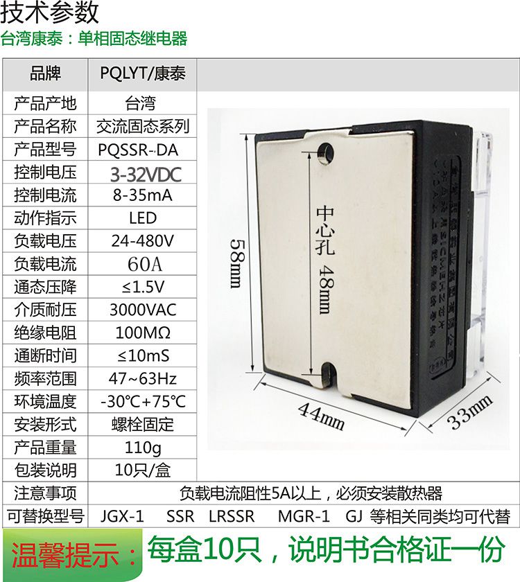 Taiwan Kangtai PQLYT single phase solid state relay PQSSR-DA SSR-60DA DC control AC 60A