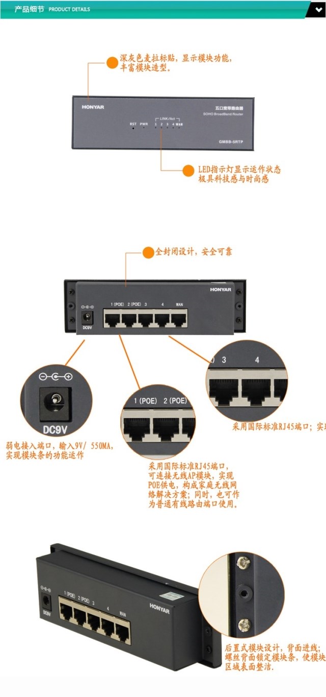 Hongyan weak current box network module five-port router with POE port can be connected to wireless AP rear line