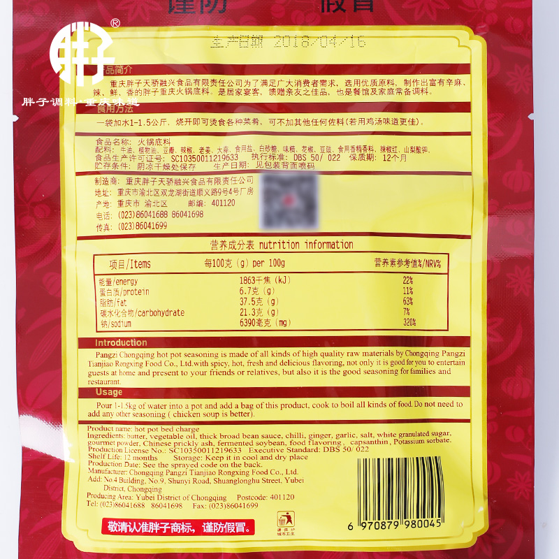Chongqing Fat Sub Hot Pot Soup Bottom 400g Spicy Hot Pot Bottom Stock Red Soup Hot Pot Seasoning Condiment Condiment Condiment