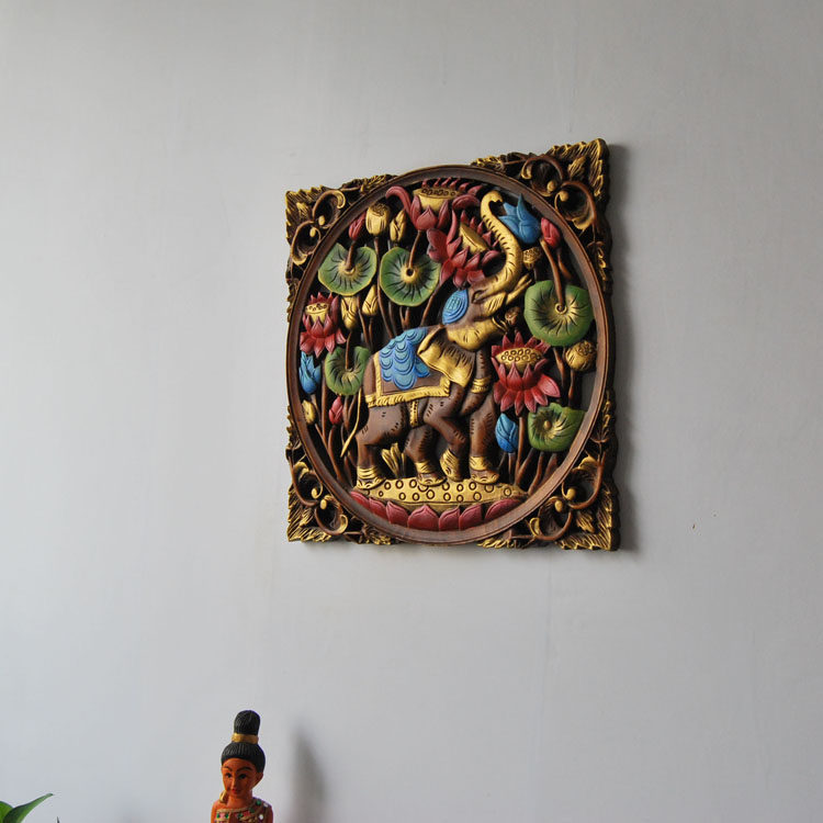 Ex-gratia Elephant Decoration Mural Hand-colored Painted Square Wood Carved Hollow Flower Plate Genguan Pendant