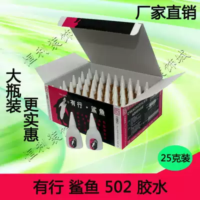 There are rows of 502 large bottles of glue 502 glue wholesale 25 grams packed with line shark glue factory direct sales