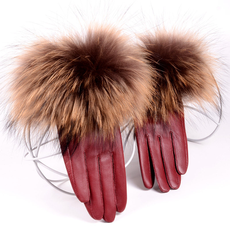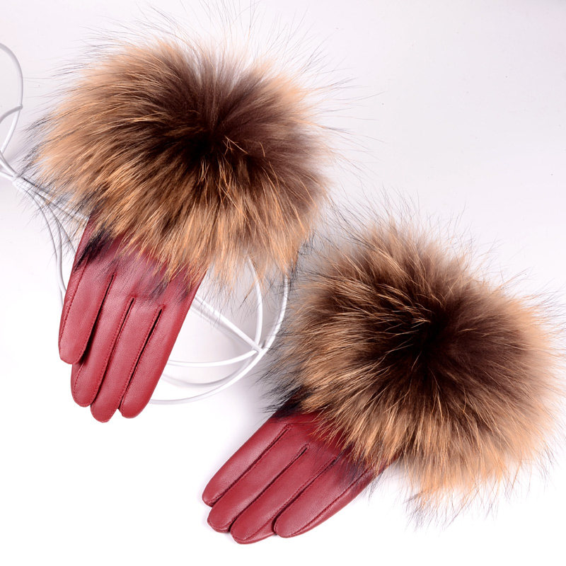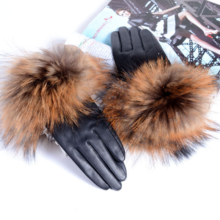 Raccoon Fur Genuine Leather Gloves Lady Winter European Station Goat Leather Gloves Leather Grass Gloves Women