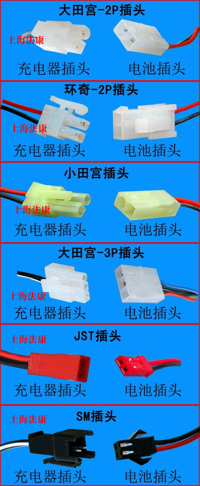 Black SM plug, red JST plug, Otamiya 2P plug, ring odd 2P plug, Otamiya plug, round hole, red line, positive pole, Otamiya plug, round hole, black line, negative pole, Tamiya 3P plug (hollow iron piece)