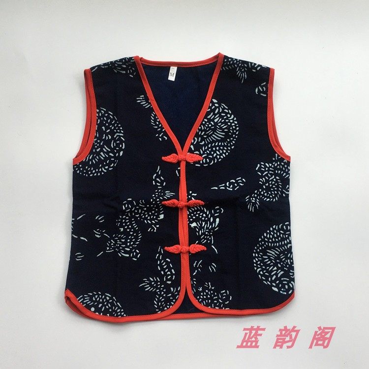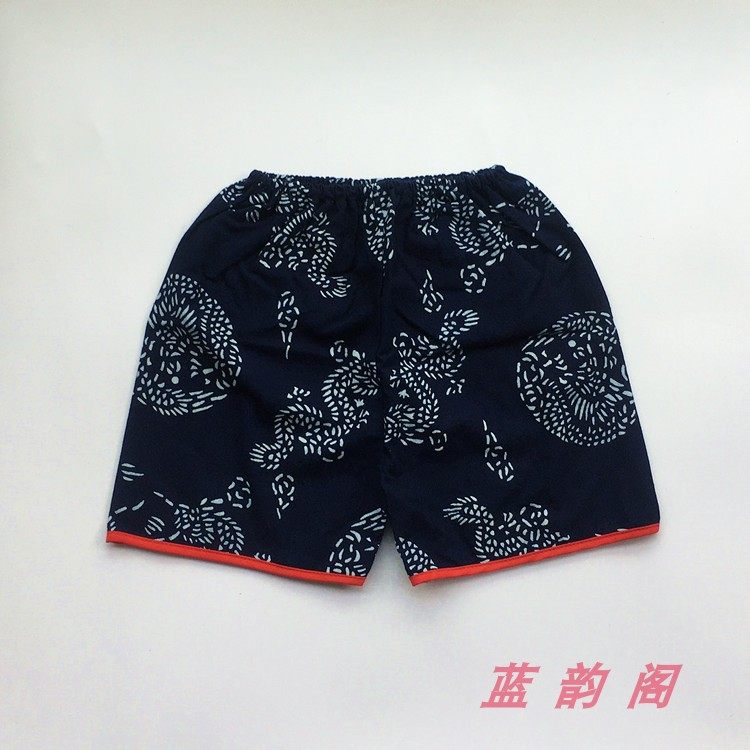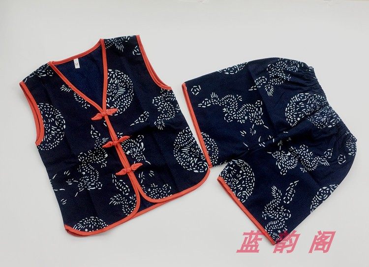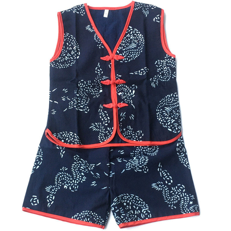 National style big boy cotton blue printed cloth boy summer sleeveless V-neck vest shorts vest shorts suit