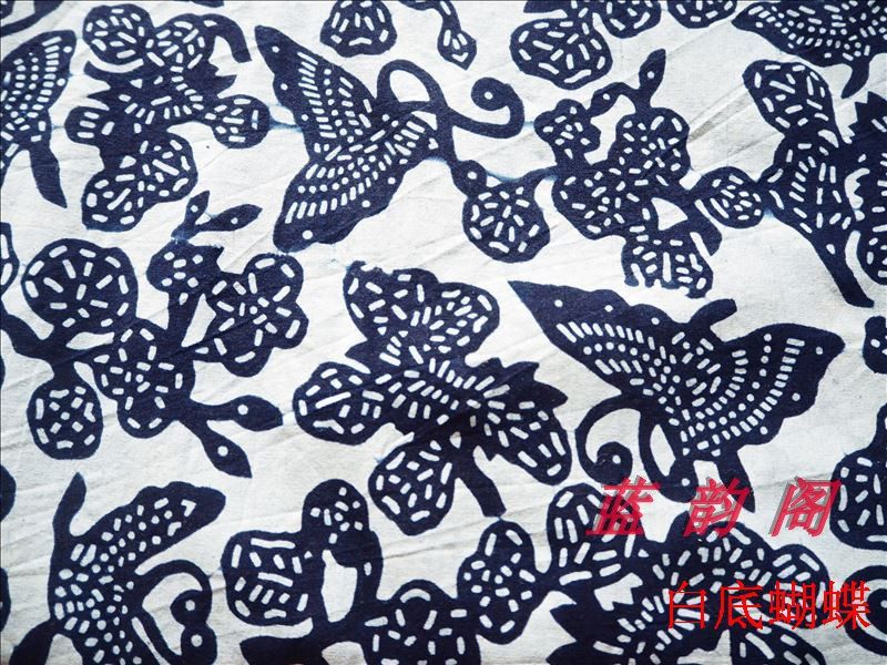Uzhen blue printed fabric handmade fabric white bottom blue flower New plant printing and dyeing butterfly full cotton fabric (butterfly love)