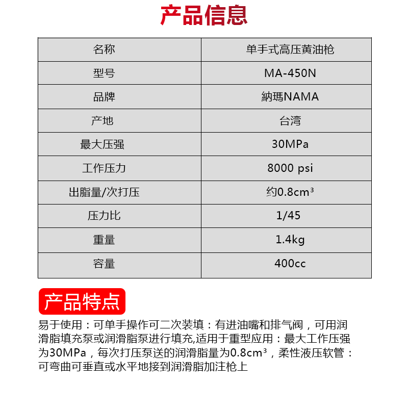 Taiwan Nama MA-450N HM-452 high pressure pneumatic grease gun oil gun refueling gun manual oiling gun