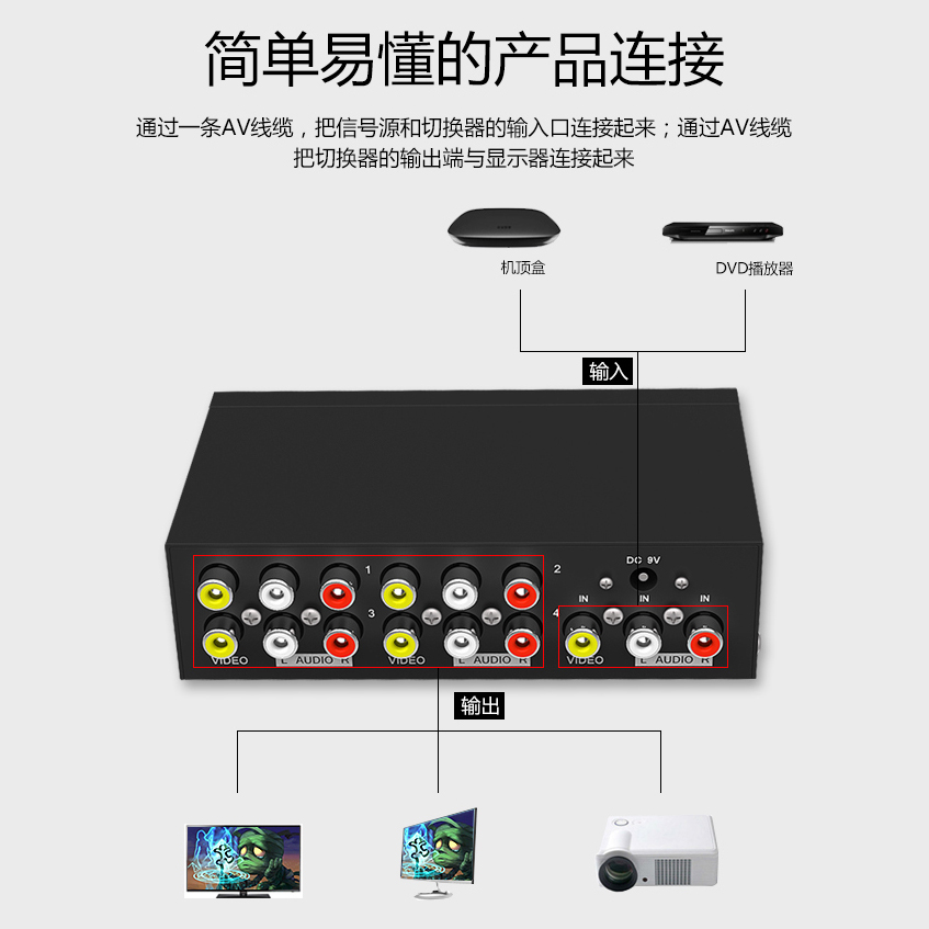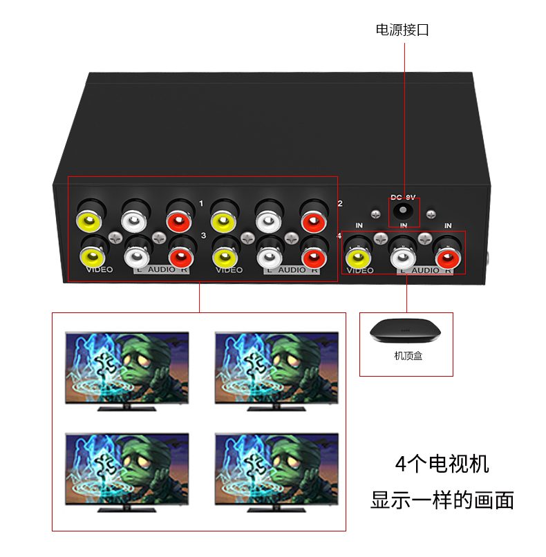 4-mouth AV one-in-four-out dispenser audio-video av frequency divider AV1 points 4 split screen 10% 4-1 tug 23 lotus