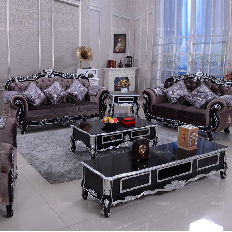 Fabric European-style sofa combination 123 luxury single black solid wood carved living room furniture complete new classical