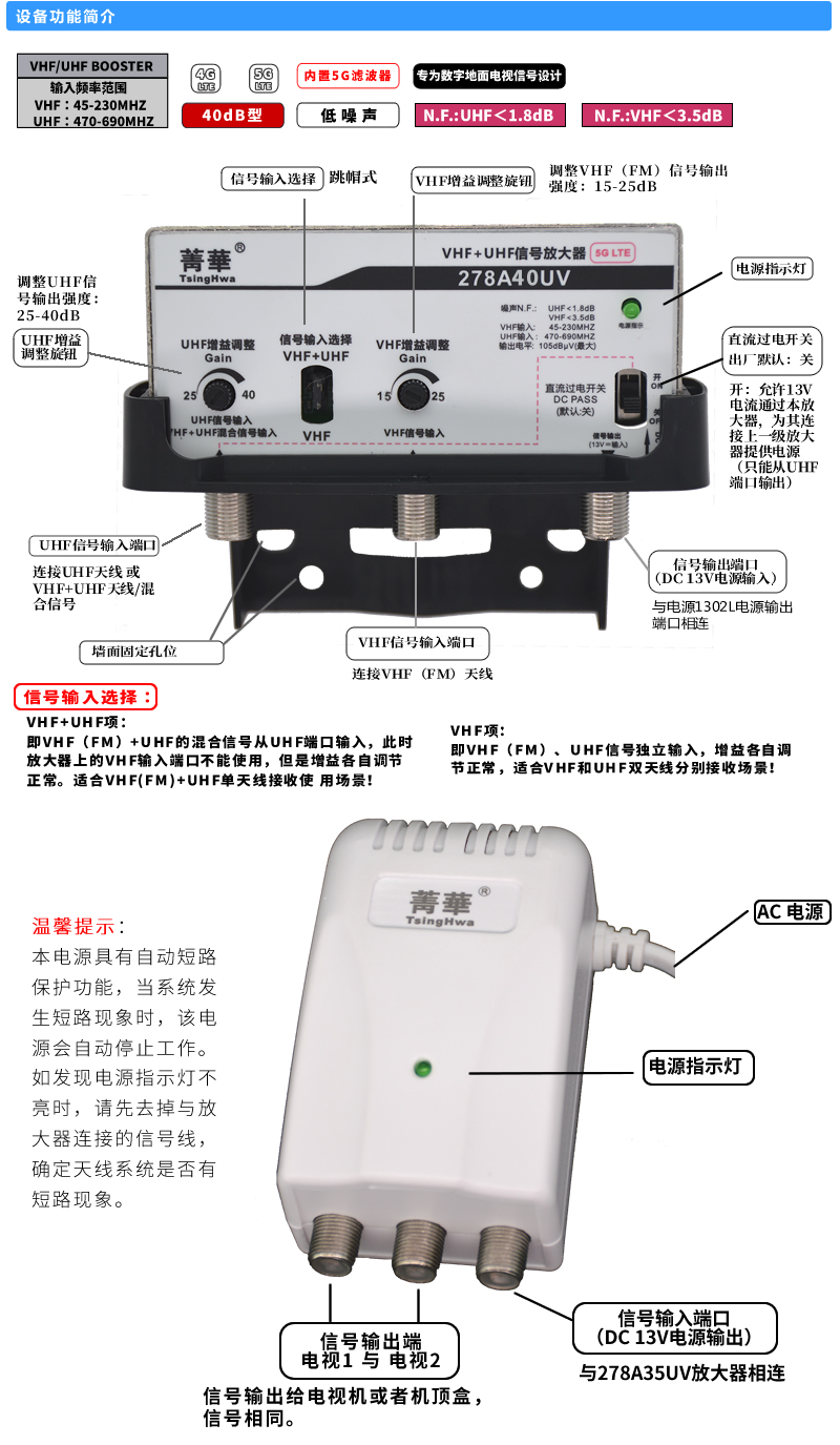 Jinghua HD Digital TV Amplifier 278A40UV 25-40dB Gain Adjustable Built-in GSM Filter