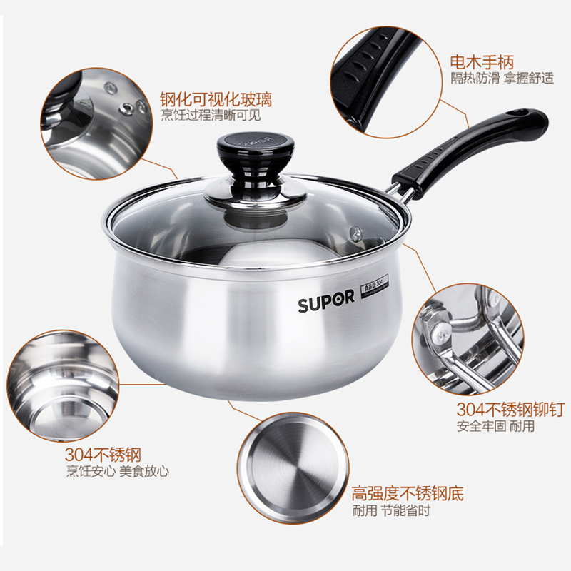 Supor 304 stainless steel milk pot small soup pot household thickened auxiliary food pot 16 18cm gas induction cooker suitable