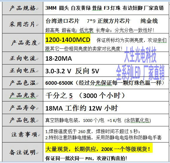 3MM round head white hair yellow green Pgreen Taiwan import chip with side manufacturer direct sales highlight second kill