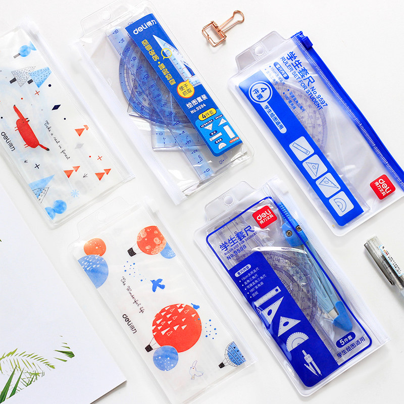 Deli stationery for primary school students with a set of ruler ruler triangle ruler protractor ruler compass set Children's four-piece set of multi-functional Japan and South Korea set of geometric graphics Cute super cute cartoon first grade