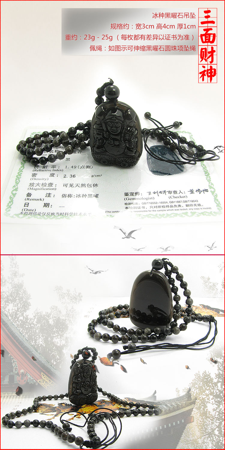 Xuanyou Daheitian Three-faced God of Wealth Ice Seed Obsidian Pendant with Certificate