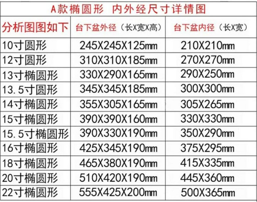 Elliptic 13 inches 33*29*16cm ellipse 16 inches 42*34*19cm ellipse 18 inches 46*37*19cm ellipse 20 inches 49*41*19 cm