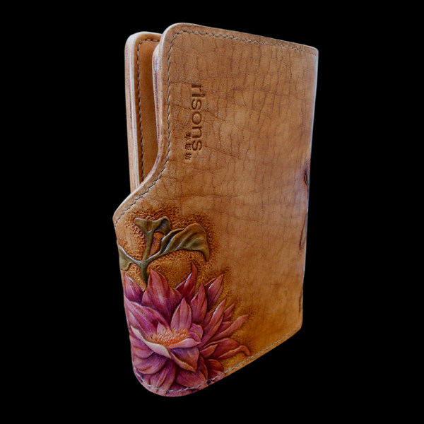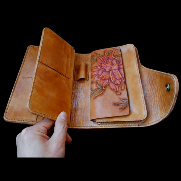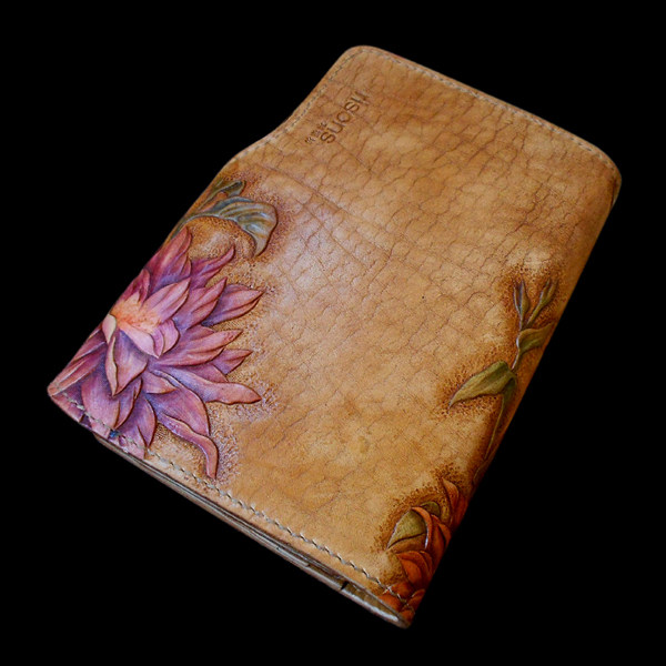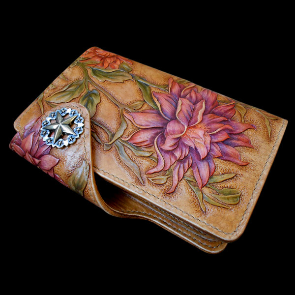 Handmade custom leather gift women's foreskin carved and painted women's dahlia clutch bag