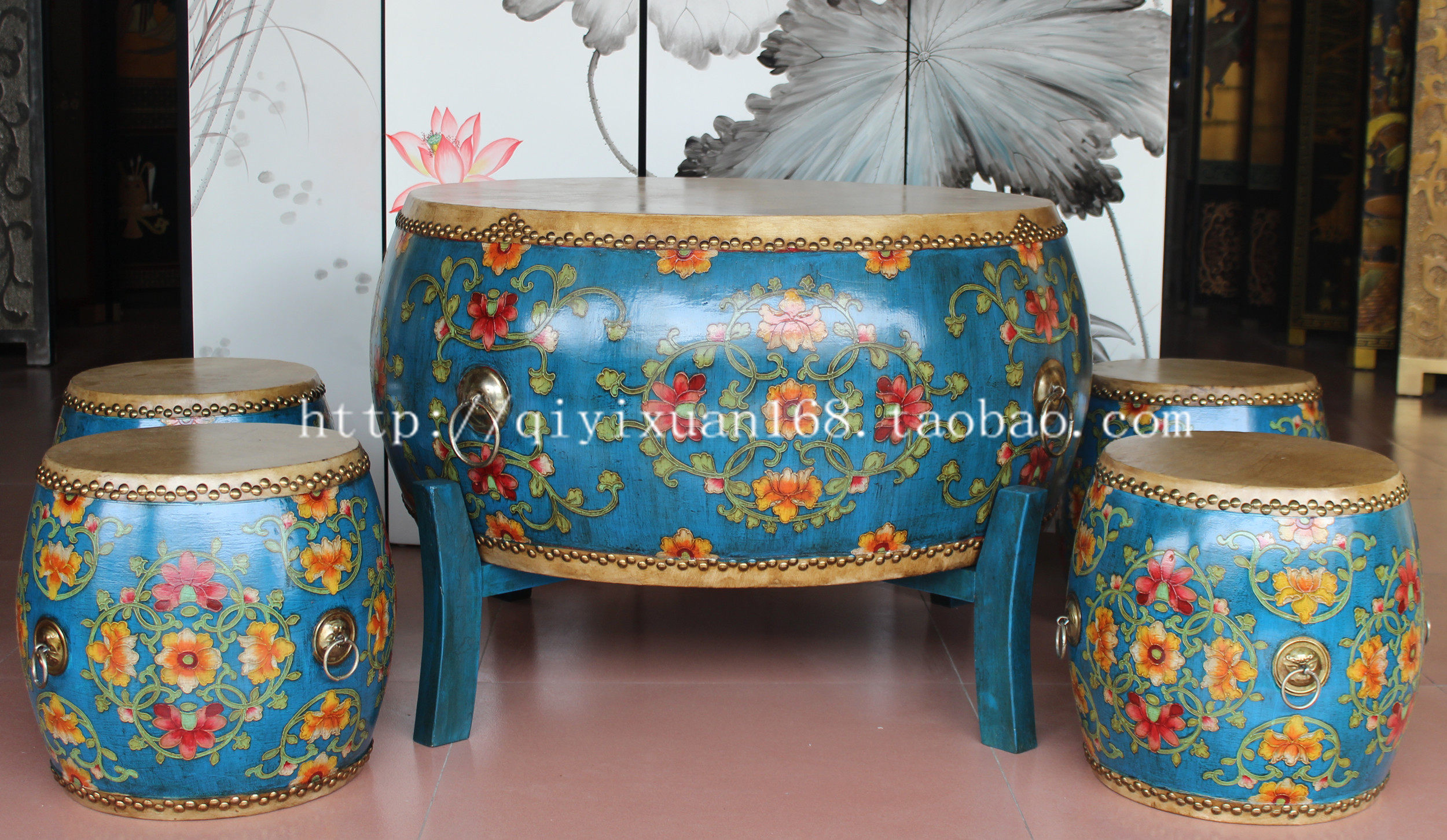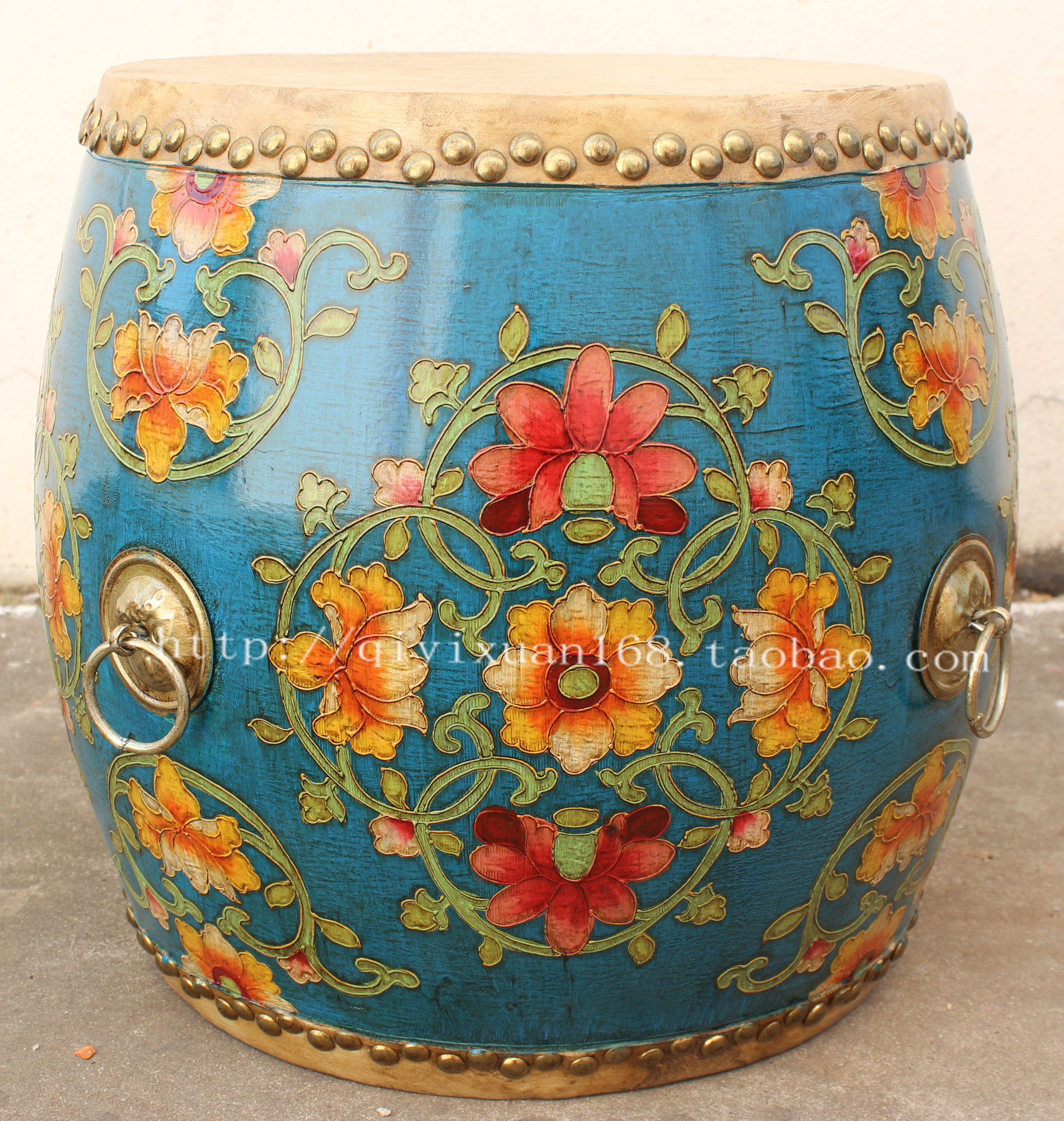 New classical furniture painted living room drum coffee table solid wood cowhide hand-painted tea table antique tea table old drum